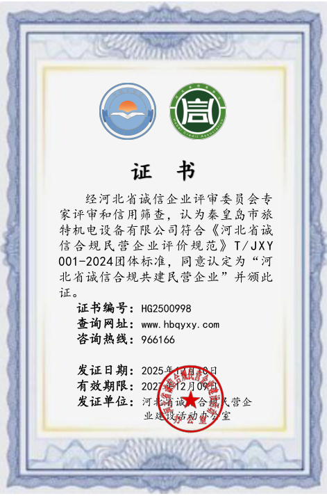 經(jīng)河北省誠信企業(yè)評(píng)審委員會(huì)專家評(píng)審和信用篩查,認(rèn)定為秦皇島市旅特機(jī)電設(shè)備有限公司符合《河北省誠信合規(guī)民營企業(yè)評(píng)價(jià)規(guī)范》T/JXY001-2024團(tuán)體標(biāo)準(zhǔn),同意認(rèn)定為‘’河北省誠信合規(guī)共建民營企業(yè)”并頒此證。